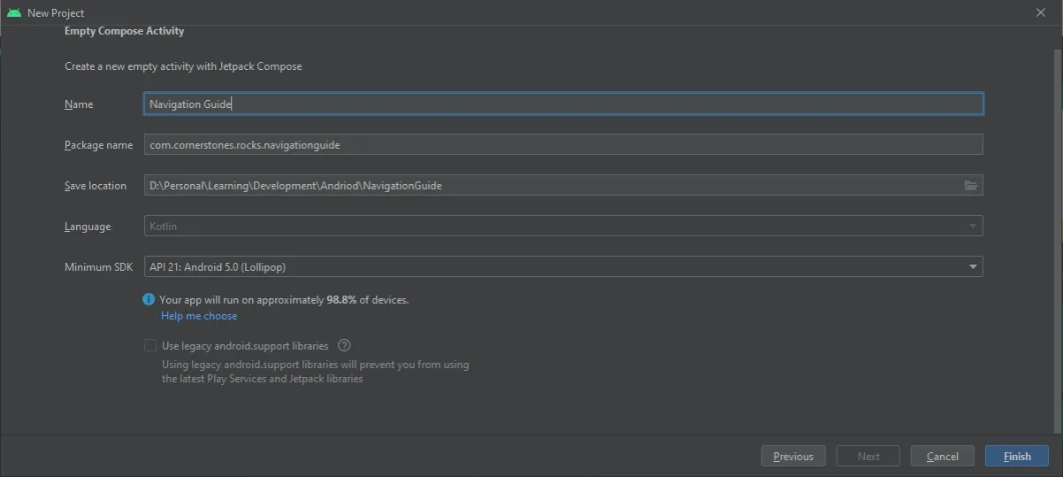 - Projekt konfigurieren: Geben Sie einen Namen für Ihre App ein (z.B. "MeineErsteApp"), wählen Sie den Speicherort und stellen Sie sicher, dass Kotlin als Sprache ausgewählt ist. Der "Minimum SDK level" bestimmt, auf welchen Android-Versionen Ihre App läuft. Für Anfänger ist die Standardeinstellung meist passend.