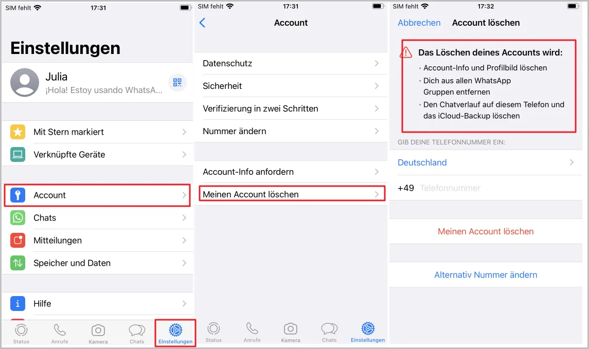 Auch für iPhone-Nutzer ist der Vorgang zum Löschen des WhatsApp-Kontos unkompliziert. Hier ist die Schritt-für-Schritt-Anleitung: